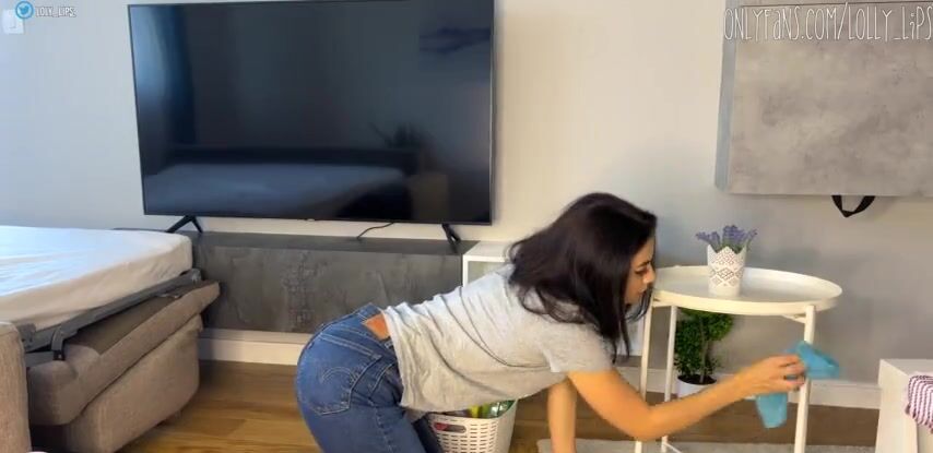 Русская студентка с классной попой и большой грудью убирает в квартире, а парень хочет секса